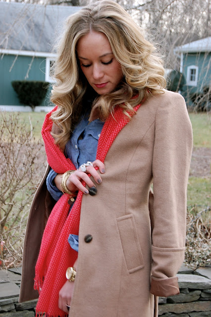 I used to hate red – wearing it, that is. But for some reason, this past winter I fell in love with it. This scarf is one of my favorite pieces, and it seemed like the perfect pop of color for an all denim outfit. Which brings me to my next point: I have never been one to love an all denim look. But I thought I’ve give it a little try (at least baby steps) and attempt to mix my hipster jeans, which I loooove, with my fave chambray top. Yay – Nay?