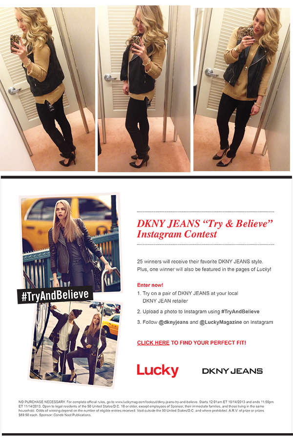 DKNY JEANS is running a fun instagram promotion right now – and it’s so easy to enter! Head to any local store that carries DKNY JEANS denim, try a pair on, and instagram a photo with the hashtag #TryandBelieve. If you don’t believe in selfies, this can be your one exception. 😉 And what’s in it for you? 25 of you will win a pair of your favorite jeans – and one lucky gal will be featured in the pages of Lucky Magazine! So head to your favorite department store or local DKNY and get to tryin’. I promise you’ll love these babes – they’re super soft and have just the right amount of give, in all the right places.