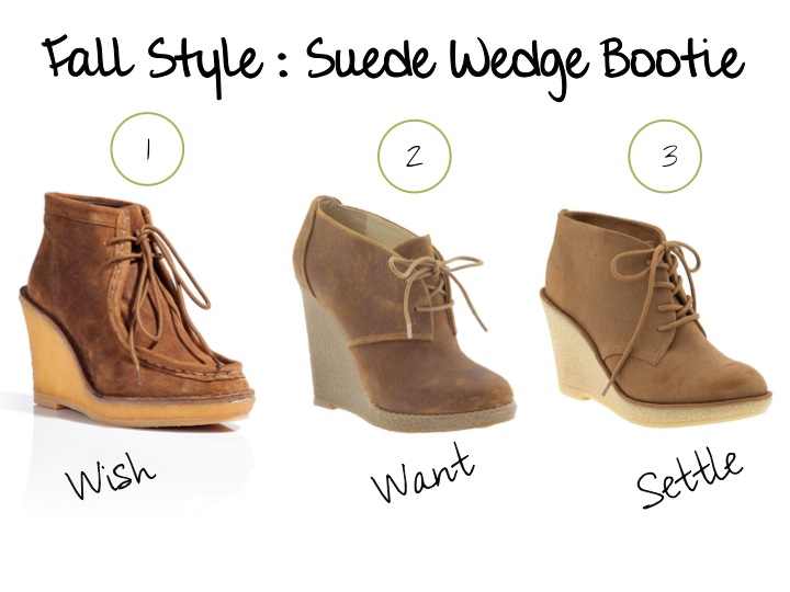 For now, I’m crushing on some suede wedge booties for fall. Especially the ones with hefty price tags, like the Marc by Marc Jacobs Wallabee’s (#1). But until I have a full-time job in place, they will just have to wait! I’ve found some perfect alternatives that will do just fine. I reeally want the Enzo Angiolini ones; they’re the perfect height and shade. But I suppose I’ll just settle for the budget friendly.