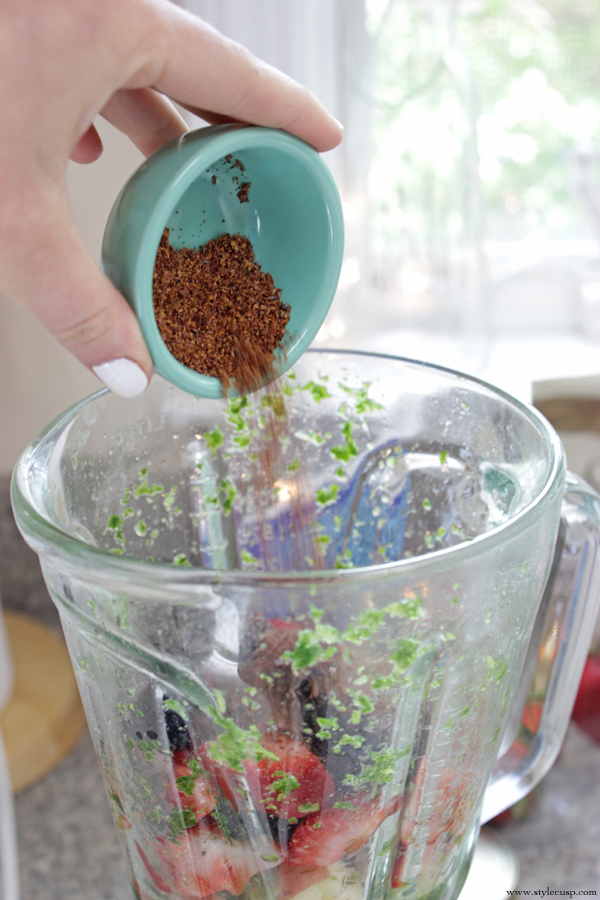 I started the #whole30 last week once again with my sister Emily so kept my smoothies this week pretty basic, with high antioxidant fruits and not ones higher in sugar (pineapple, ahem.) My favorite smoothie is one that contains any kind of berry, and lucky for me they’re high in antioxidants (among other things). I also reached for my flax seed, that contains some crushed blueberry, and some chia seeds –> hello, superfood! And as always, I added a handful of greens.