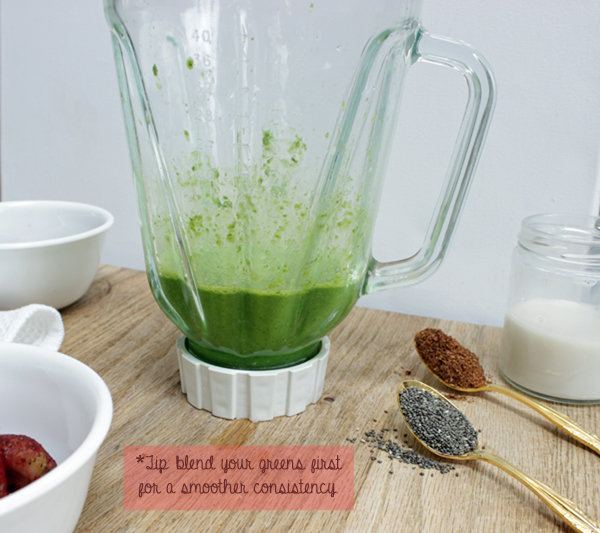 I have also gotten into the habit of blending my greens before any other smoothie components. This 1) leaves more room in your blender and 2) gets a smooth base (especially if you’re using kale) before mixing in a load of other ingredients. Pour half the coconut milk in with the kale and blend before adding the remaining ingredients.