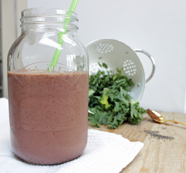This week’s edition of ‘the smoothie bar’ is one of my go-tos: lots of greens and some yummy, fresh berries. Kale is a major component of any of my smoothies (just wait, you’ll see!) and I just love berries for loads of reasons – one of them being that they’re high in antioxidants. After I blended this one up, I realized I unintentionally had made it a “pb+j” smoothie by way of the flavors blending together. So for the little peanut butter and jelly loving kid in you, this’ll hit just the right spot!