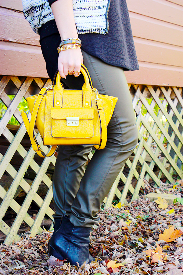 I scored these faux leather pants at H+M a few weeks back ($10!) and wear them every few days. They’re super comfortable and the perfect deep green for fall. I also love the bright citrine yellow shade of the Phillip Lim bag – as soon as Laura asked me to be part of the Jewel Tones linkup, I knew this little ‘lim’ would be included!