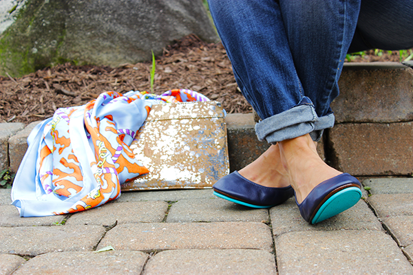 Style Cusp is wearing: Target Tee (best vnecks – $6 right now!) // Zara denim (similar pairs) // Tieks flats // gifted Lemon Stripes Scarf // Persifor Clutch (on sale!) // Galisfly knuckle rings // Lydell NYC coral bangle