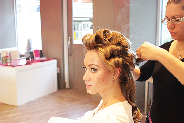 2. Next up is the BLOW. The stylist blew out my hair half way and then took individual pieces and blew out each of them separately to create volume. Once she blew each piece out she clipped it back in a faux roller style (below).