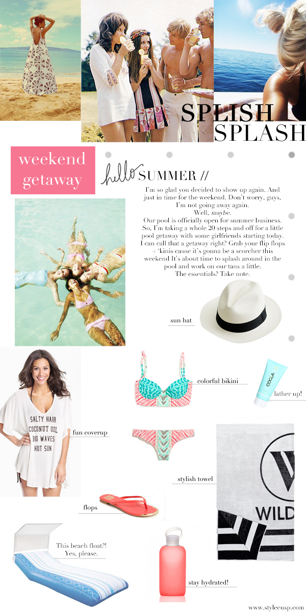 (from top: hat // bikini // SPF // beach towel // BKR bottle // flip flops // beach float // coverup)